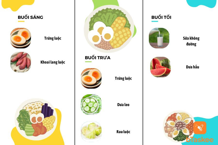 - Bữa sáng: 2 quả trứng luộc, 1 khoai lang