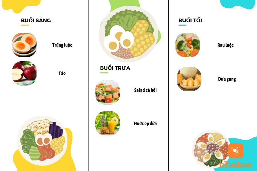 - Bữa sáng: 2 quả trứng luộc, 1 quả táo