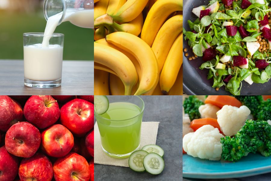 - Các loại rau, củ, quả: đây là một nguồn cung cấp vitamin, chất xơ, nước,… vô cùng tốt cho cơ thể. Không những vậy, chúng cũng hỗ trợ giúp cơ thể cảm thấy không bị đói quá nhanh, hỗ trợ giảm cân rất tốt. Các loại hoa quả có chứa nhiều nước mà người đang ăn kiêng nên sử dụng như dưa hấu, chuối, cam, củ đậu, táo,…