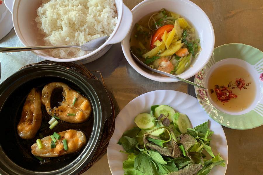 - Buổi tối: Cơm trắng + cá chép chưng tương + canh tép rau cải trời.