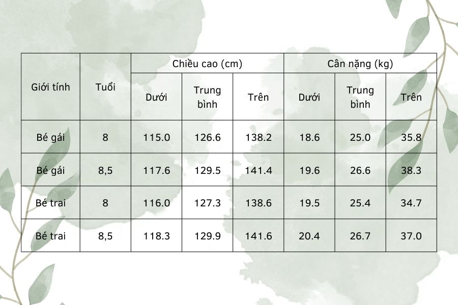 Theo số liệu nghiên cứu của tổ chức Y tế Thế Giới về chiều cao và cân nặng chuẩn đối với trẻ 8 tuổi dựa trên giới tính như sau: