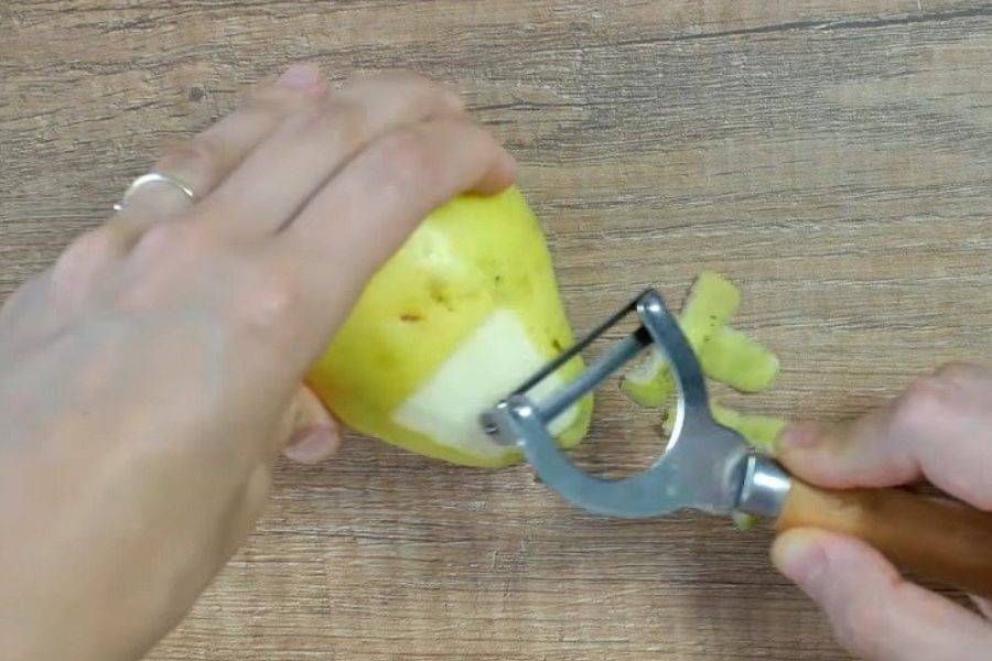 - Bước 1: Dùng dao gọt một phần phía trên của quả lê với độ rộng khoảng 4 cm. Sau đó, dùng dao bào sạch lớp vỏ lộ phần thịt trắng bên trong để tạo hình đầu chú nhím.