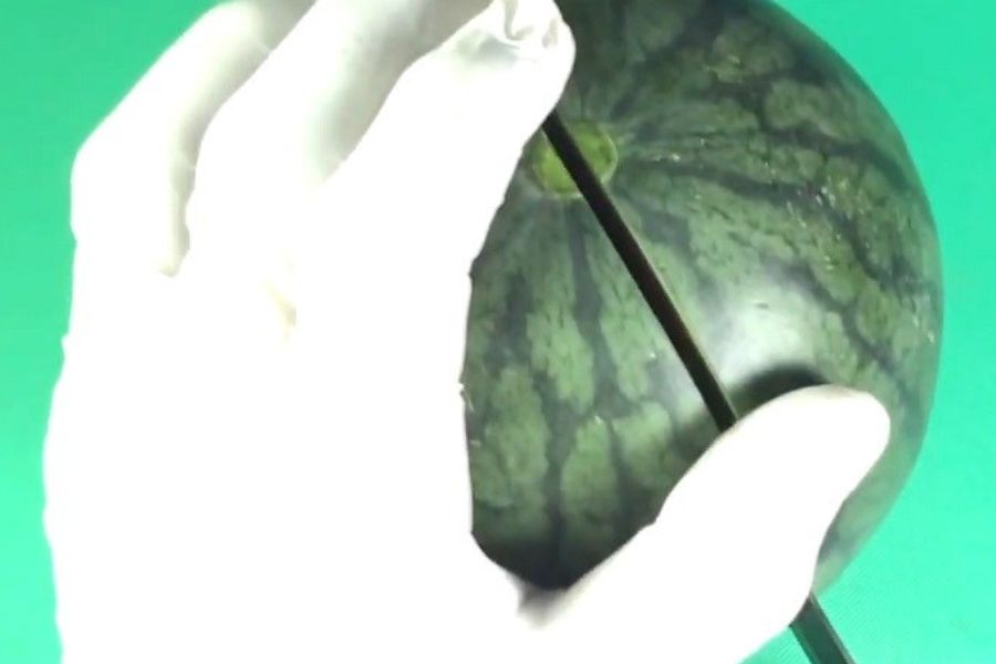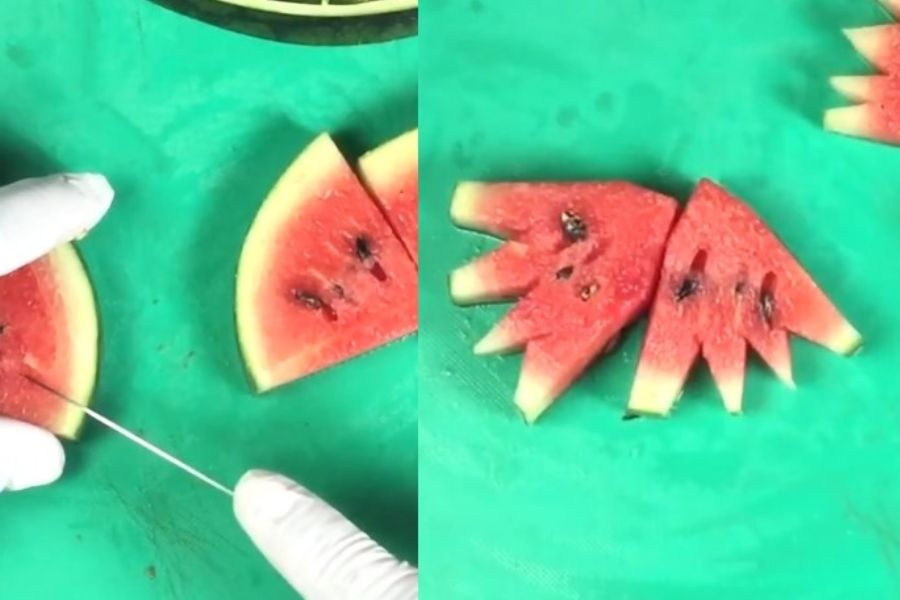 - Bước 3: Lấy phần màu xanh của vỏ dưa và bào thành sợi mỏng rồi cắt nhọn cả hai đầu. Sau đó, bạn nhét những sợi vỏ dưa vừa bào vào các lỗ nhỏ thành hình đan xen và đổ phần thịt dưa hấu vào bên trên là hoàn tất.