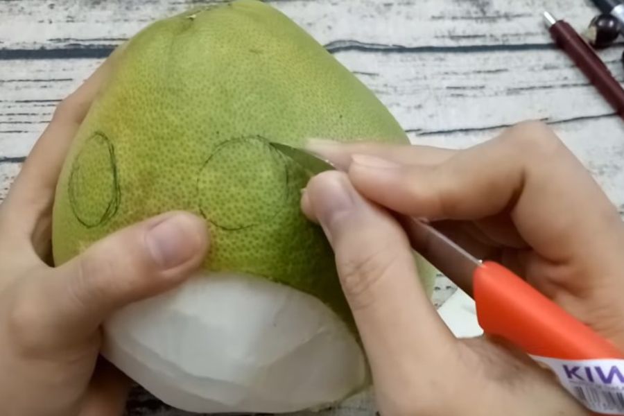 - Bước 2: Dùng dao khoét 2 đường tròn nhỏ để làm phần tròng mắt. Tỉa mỏng phần vỏ bưởi vừa khoét ở bước 1 để làm tai và đuôi heo.