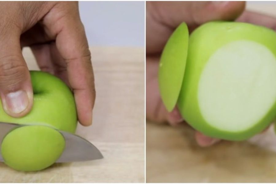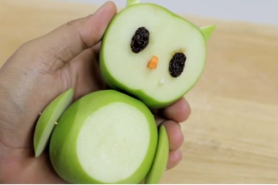 Bước 1: Rửa sạch quả táo và cắt một lát mỏng khoảng ½ đốt ngón tay sao cho có độ cong và tương tự cho phía đối diện để làm cánh của cú mèo. Dùng tăm tre cố định phần cánh vừa cắt tỉa vào hai bên thân của cú mèo.