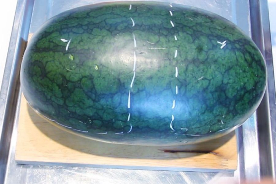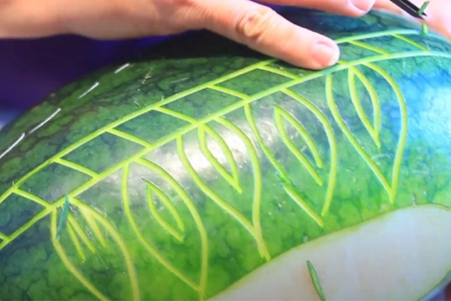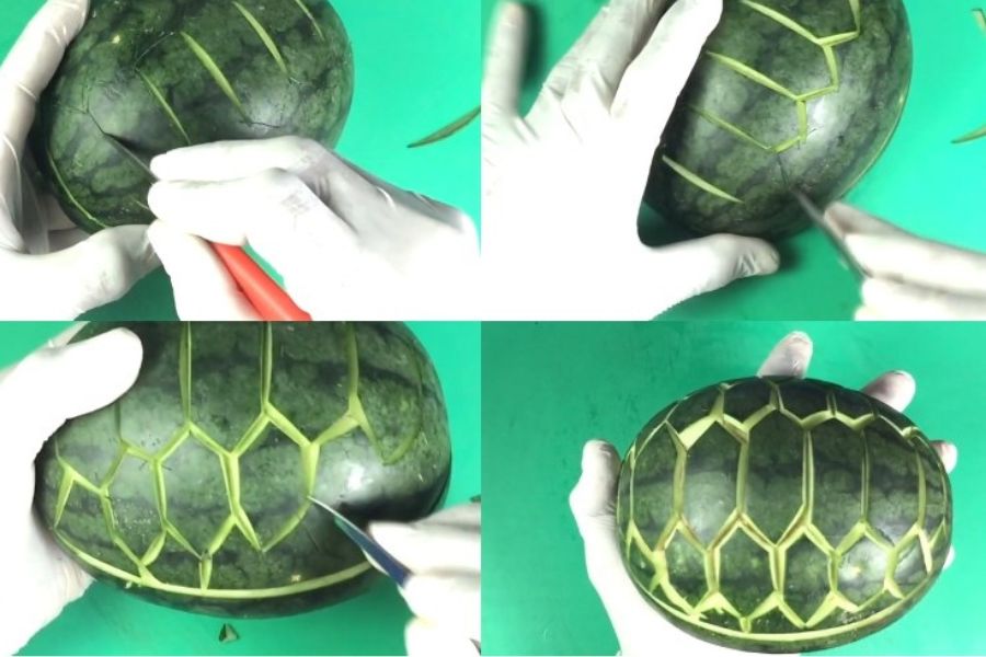 - Bước 2: Tỉa ⅓ phần phía trên của quả dưa hấu. Sau đó, bạn dùng bút mực vẽ đường mai rùa và dùng dao để khắc những đường mai đã vẽ.