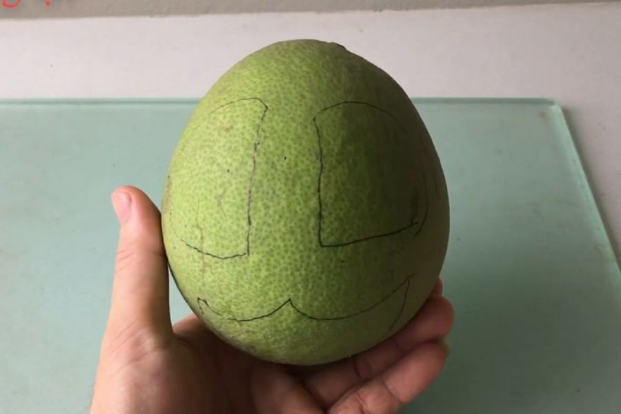- Bước 1: Bạn cắt một phần nhỏ trên đỉnh đầu của vỏ bưởi để làm mũi heo.