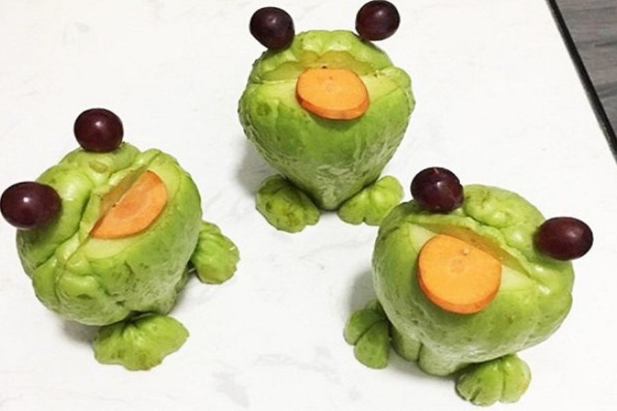 - Bước 1: Rửa sạch su su bằng nước muối và khoét phần đầu thành một rãnh nhỏ để làm miệng chú ếch.