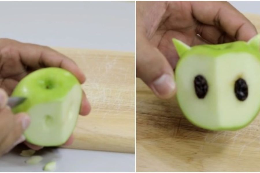 - Bước 2: Sử dụng một quả táo khác có kích thước nhỏ hơn và cắt thành 2 lát hình chữ V để tạo hình khuôn mặt. Tiếp đến dùng dao khoét hai lỗ tròn nhỏ để làm mắt và hai lỗ hẹp dài phía trên cùng để làm tai.