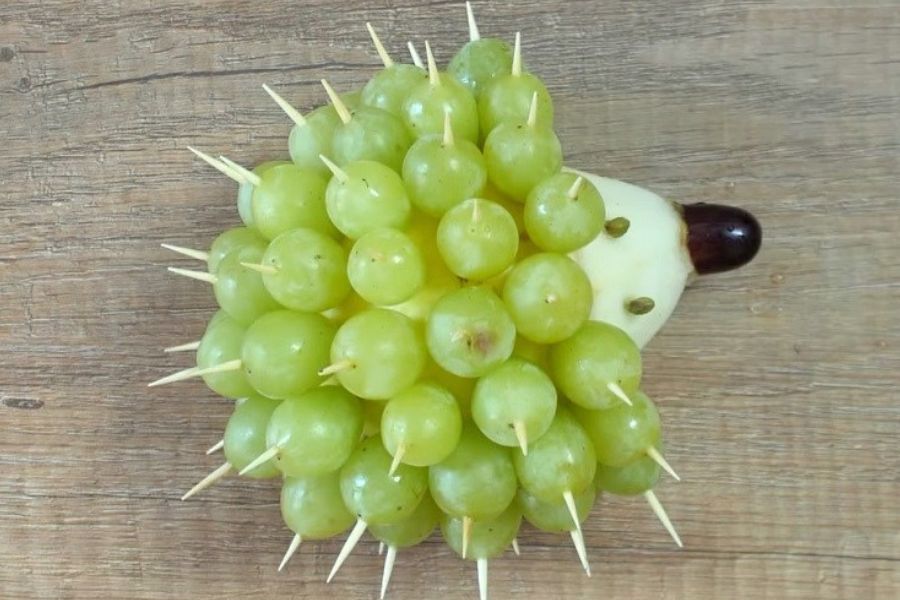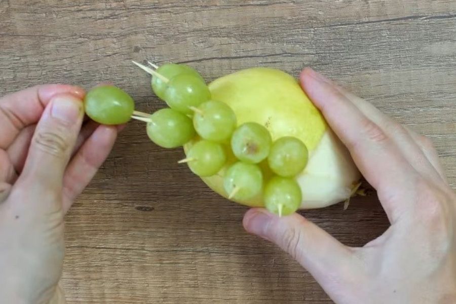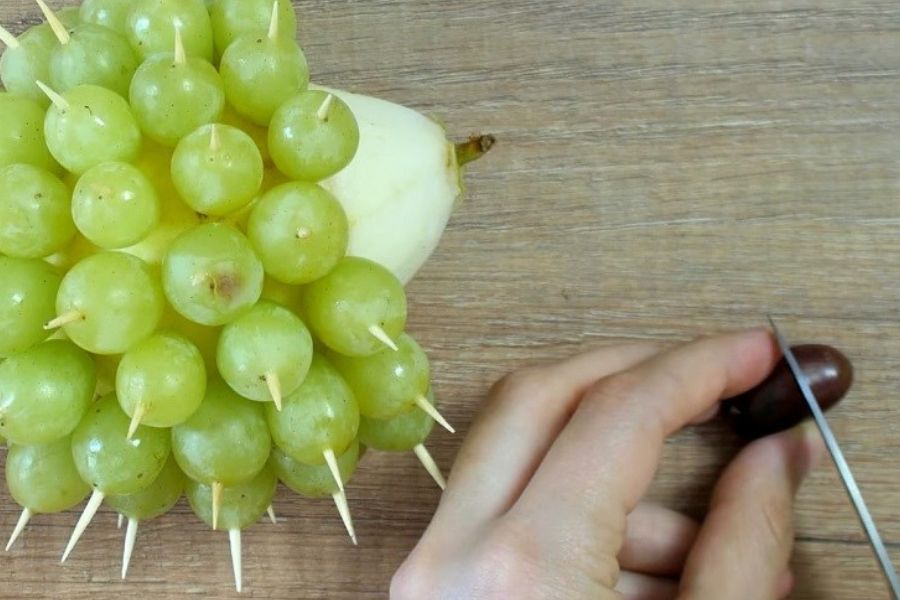 - Bước 2: Rửa sạch nho, dùng tăm tre ghim vào đỉnh đầu của từng quả nho và gắn lên phần thân của quả lê để làm gai nhím.