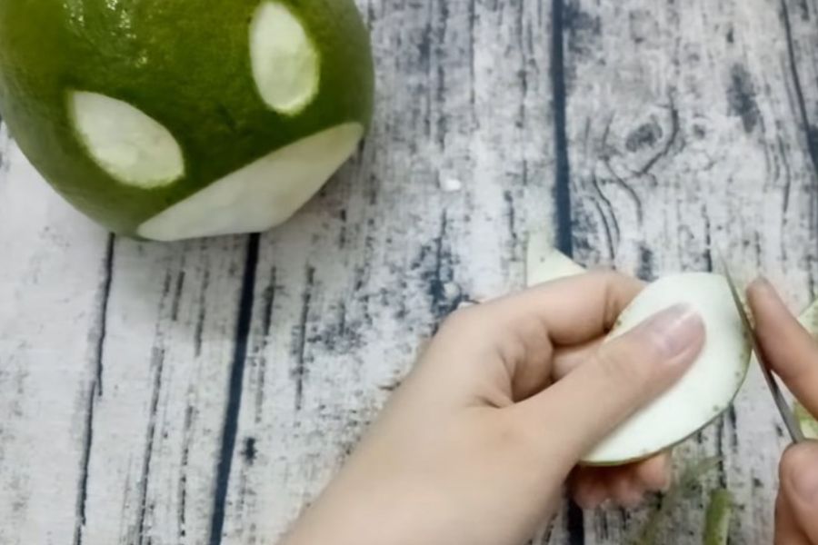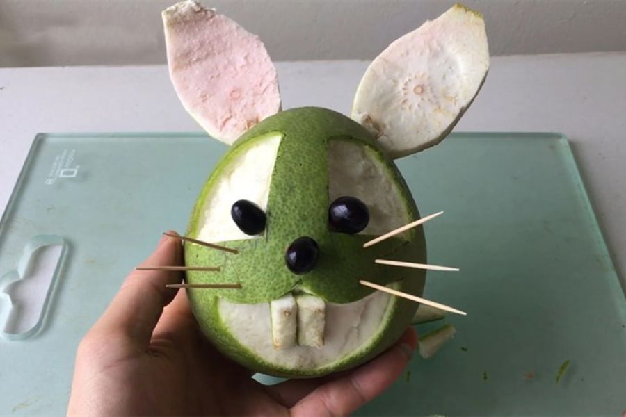 - Bước 5: Cắt lớp da bưởi thành hai mảnh chữ nhật nhỏ, dùng tăm ghim vào phần rãnh miệng để làm răng thỏ là hoàn thành.