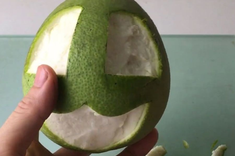 - Bước 4: Cắt phần da bưởi còn thừa thành hai mảnh có kích thước dài 6 – 7cm và rộng 2 – 3cm để làm tai thỏ. Sau đó dùng tắm ghim lên phía đỉnh quả bưởi là được.