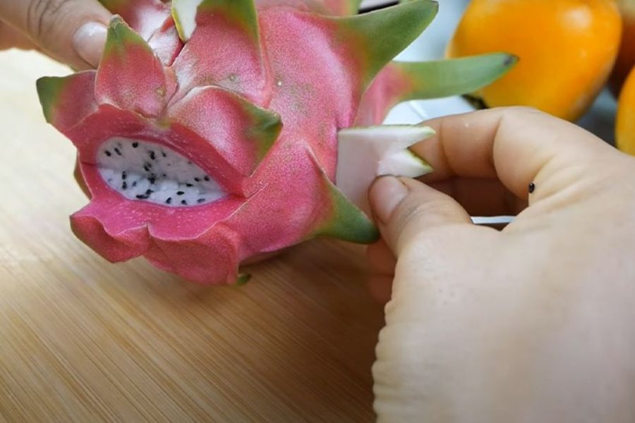 - Bước 1: Rửa sạch thanh long và cắt đôi thành nhiều khoanh tròn. Sau đó vạt một phần đầu của miếng thanh long vừa cắt.