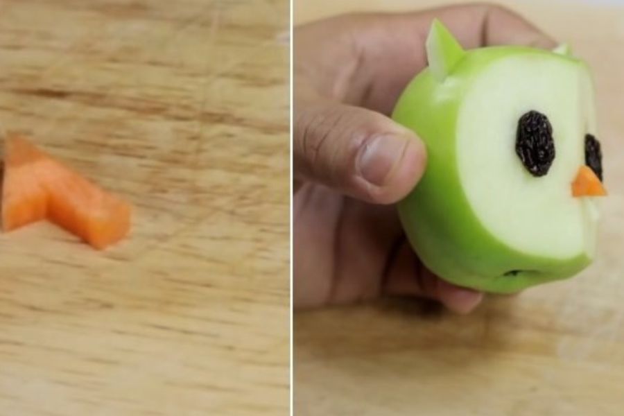 - Bước 3: Dùng nho khô để làm mắt và tỉa một mảnh táo nhỏ hình tam giác để làm tai cú mèo. Đồng thời, bạn cắt thêm một mảnh cà rốt thành hình số 1 nhọn để tạo hình phần mũi.