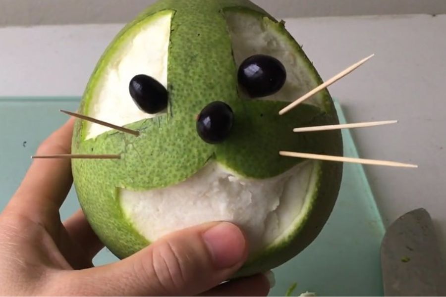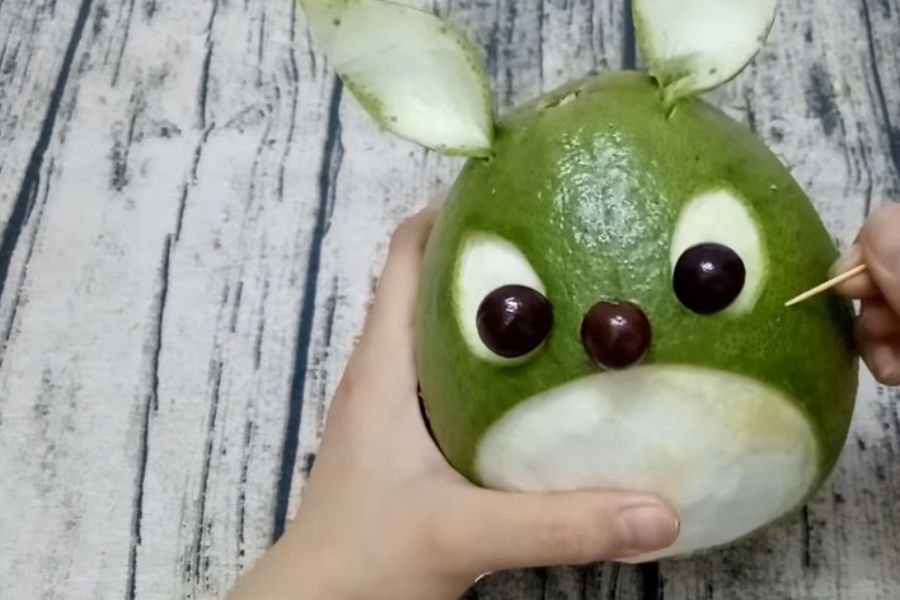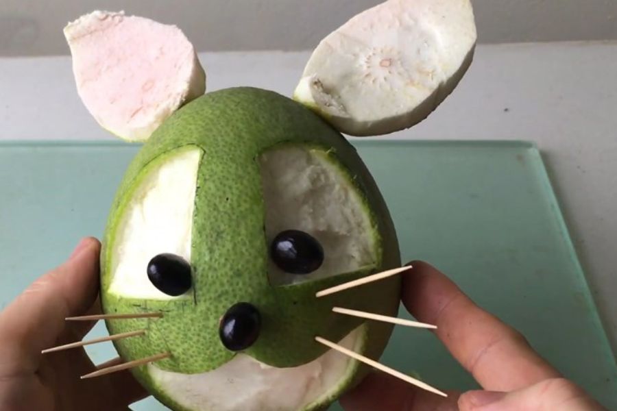 - Bước 4: Dùng dao khoét nhẹ phần rãnh ở phía trên cùng và nhét phần da bưởi đã tạo hình phía trên để làm tai chuột. Cuối cùng, bạn dùng tăm tre ghim vào hai bên đối xứng để làm râu là hoàn tất.