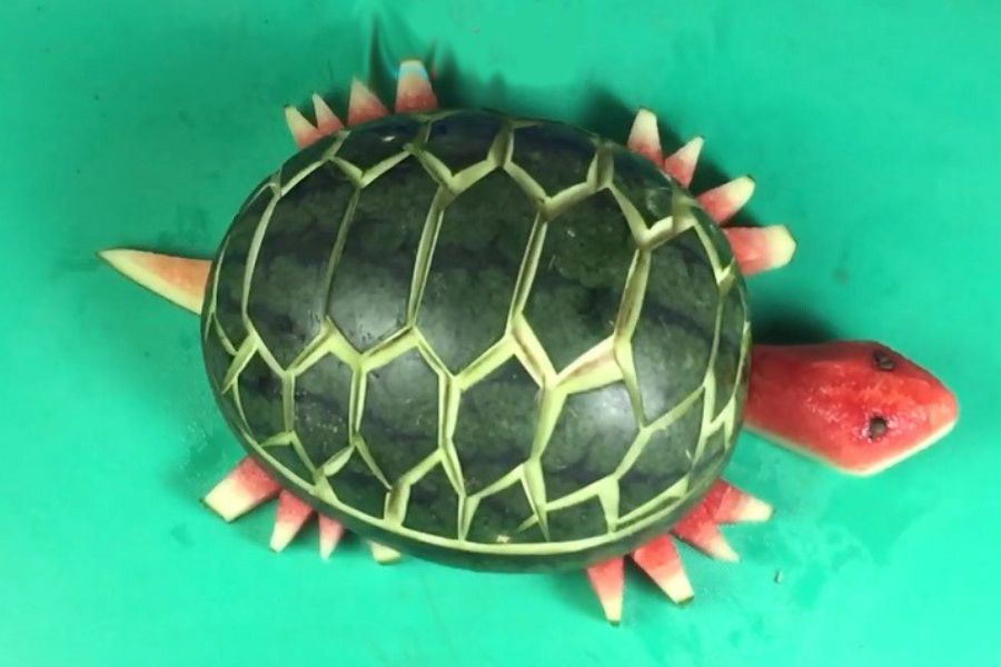 - Bước 3: Bạn dùng vỏ dưa hấu tỉa hình chân và đầu rùa. Sau đó, bạn dùng đậu (đỗ) đen hoặc tiêu gắn đối xứng làm mắt rùa.