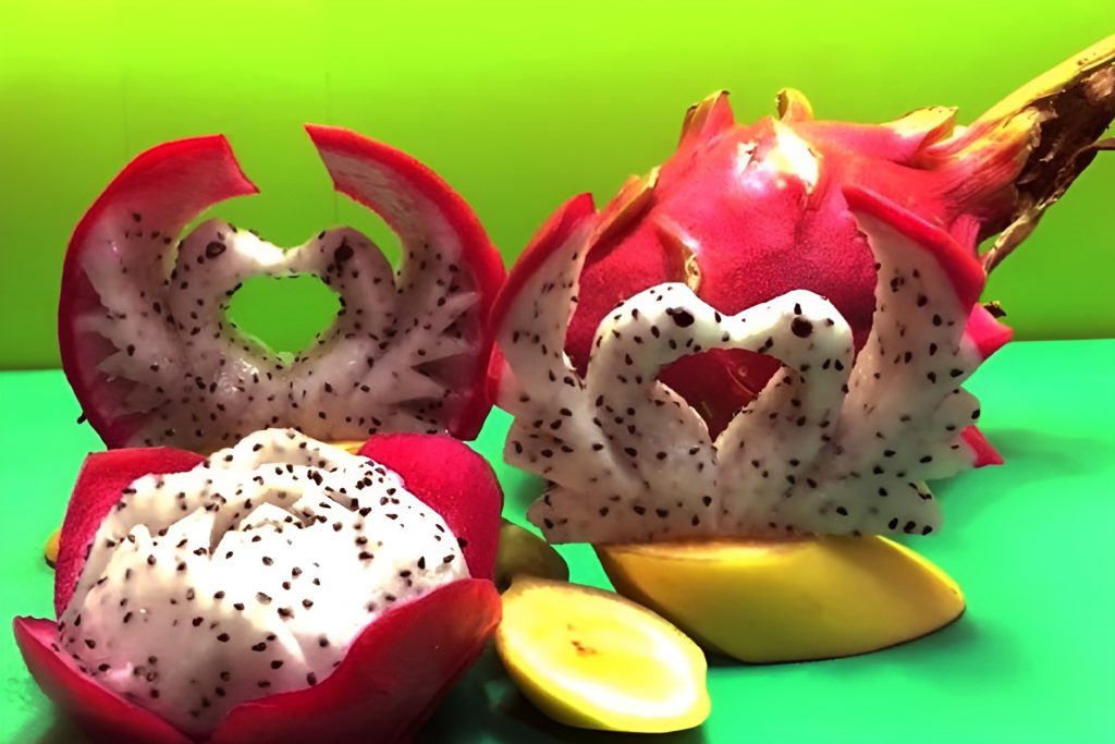 - Bước 2: Tỉa và khoét một hình trái tim bên trong ruột của thanh long sao cho mũi nhọn cùng hướng với phần vừa vạt ở bước 1.