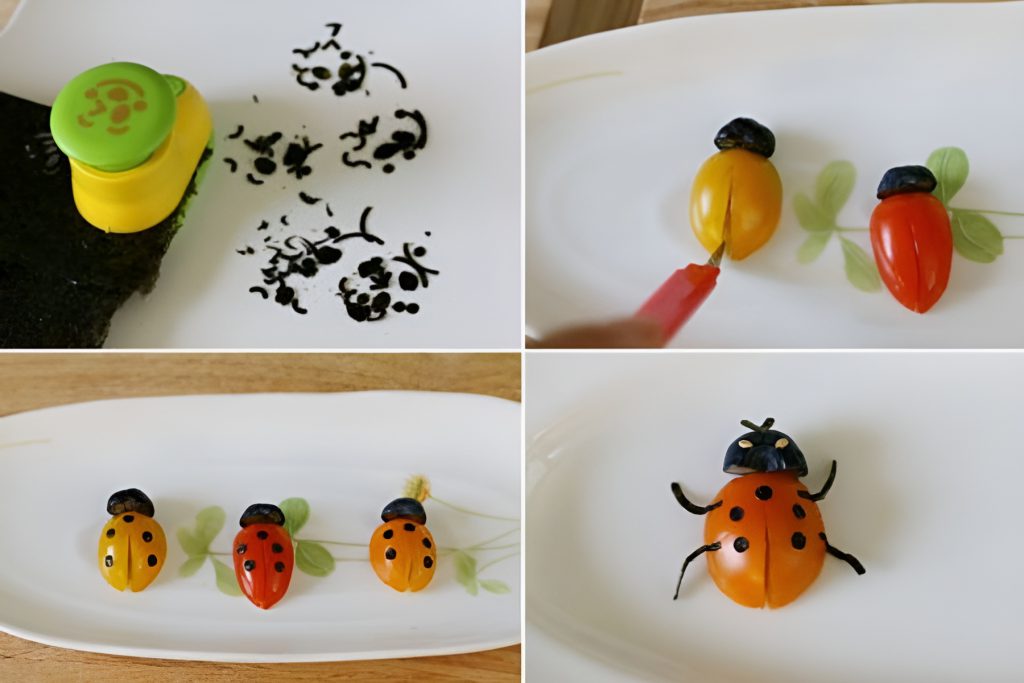 Tỉa hoa quả Trung thu hình chú bọ rùa từ quả cà chua bi
