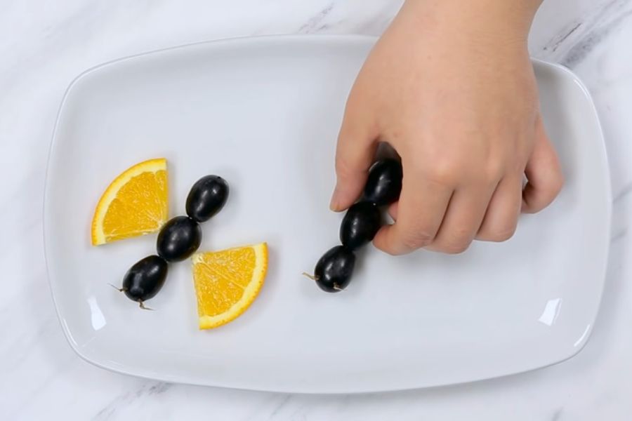 - Bước 2: Bạn rửa sạch nho và cố định khoảng 03 – 05 quả nho bằng tăm tre. Cuối cùng, bạn dùng tăm để gắn những lát cam nhỏ vừa cắt vào phía đối diện hàng nho dọc để tạo thành hình chú bướm.