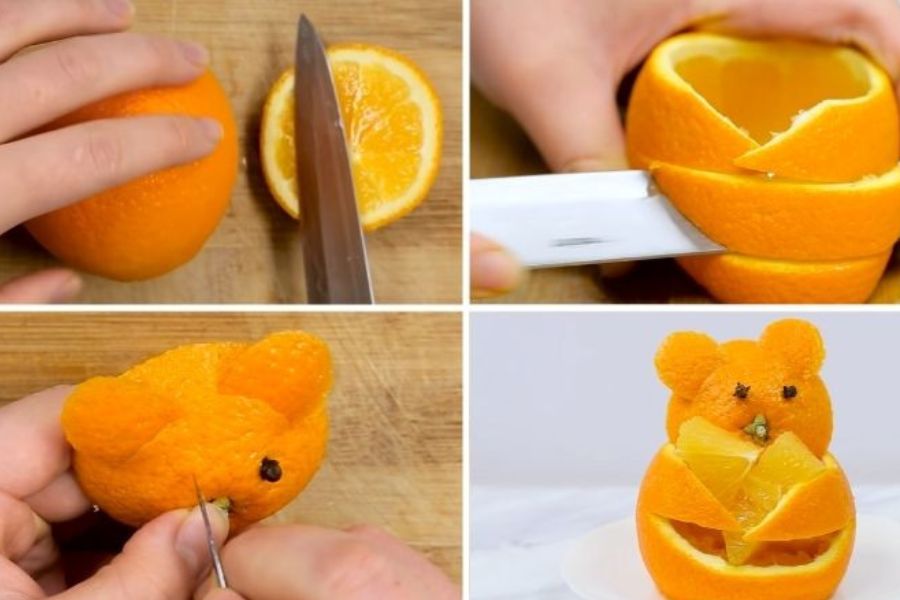 - Bước 2: Tỉa hai mảnh tam giác nhỏ ở phần vỏ cam để làm tay của chú gấu. Tiếp đến, bạn cắt thêm 2 mảnh nhỏ ở phần đầu vỏ cam để tạo hình tai, cùi cam để làm mắt và trang trí xung quanh thêm đẹp mắt là hoàn thành.