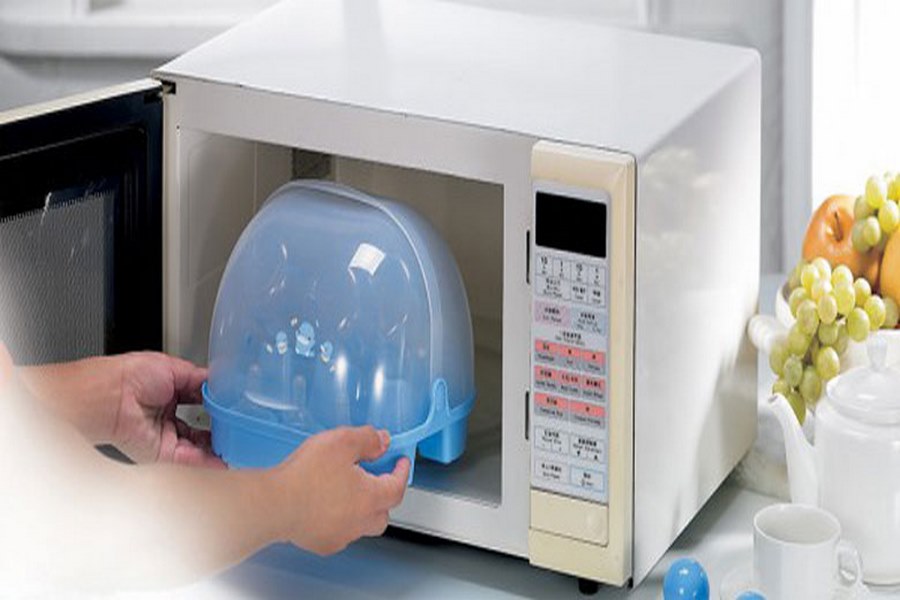 Nếu nhà có lò vi sóng, các mẹ có thể tiệt trùng bình sữa như sau: Rửa sạch bình đặc biệt các vết sữa khô, cho tất cả vào một cái hộp đựng ngập nước, quay trong lò vi sóng tầm 5 – 10 phút.