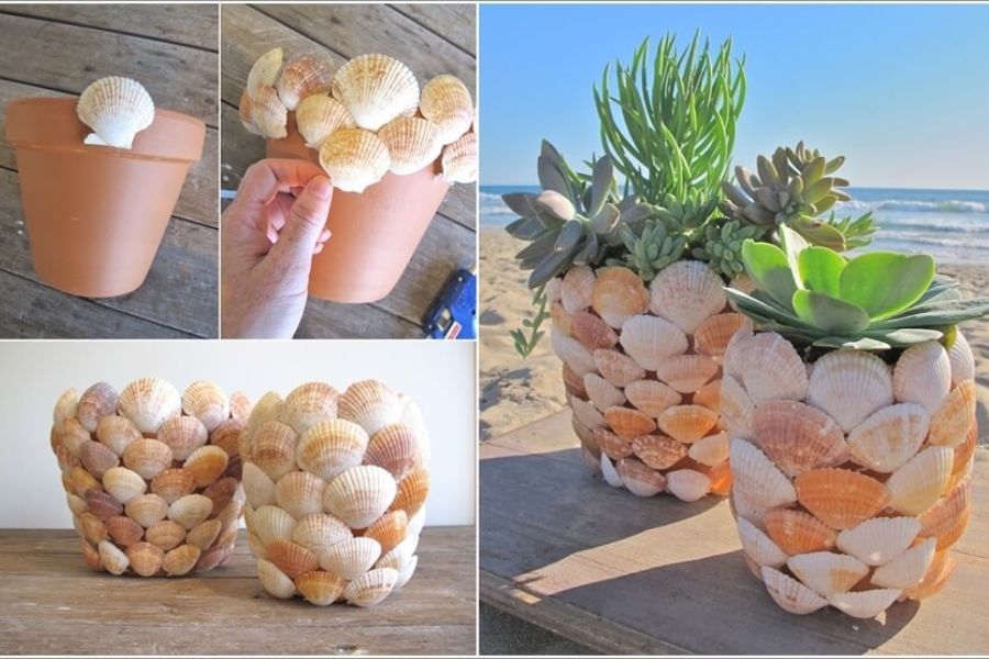 Gắn vỏ sò lên miệng chậu cây cảnh sẽ mang lại sự nổi bật, thu hút. Không chỉ được ngắm nhìn sự hoang dã, xanh mát của rừng xanh qua màu lá cây mà còn có vẻ đẹp của đại dương qua hình ảnh vỏ sò.
