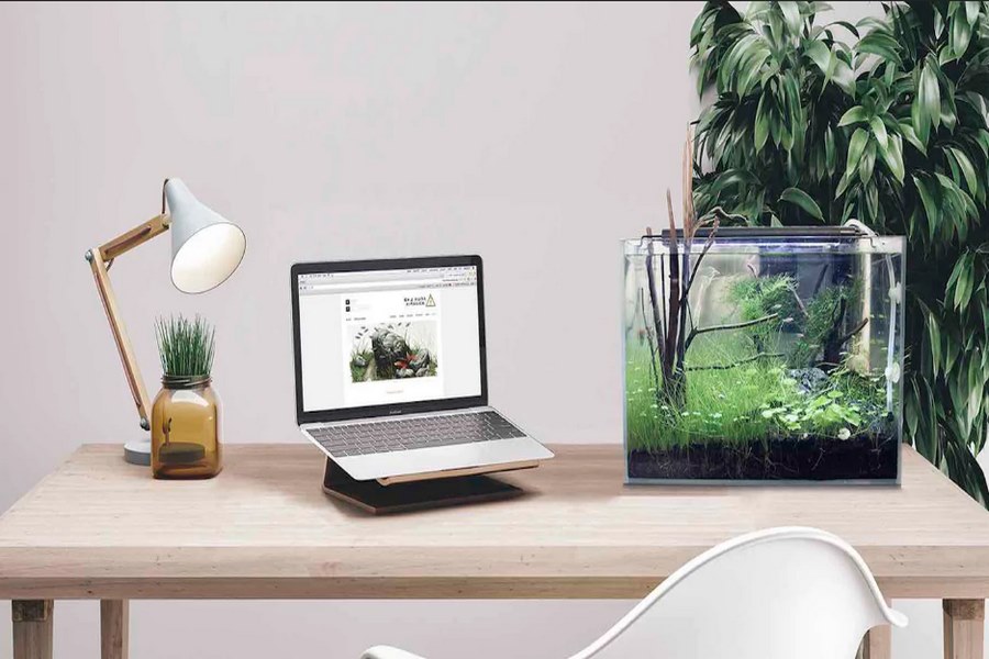 Trên bàn làm việc bạn có thể đặt một chiếc bể cá cảnh loại mini, được trang trí tối giản với cát, một chút ánh sáng của đèn led và cây giả là đã vô cùng tuyệt hảo.