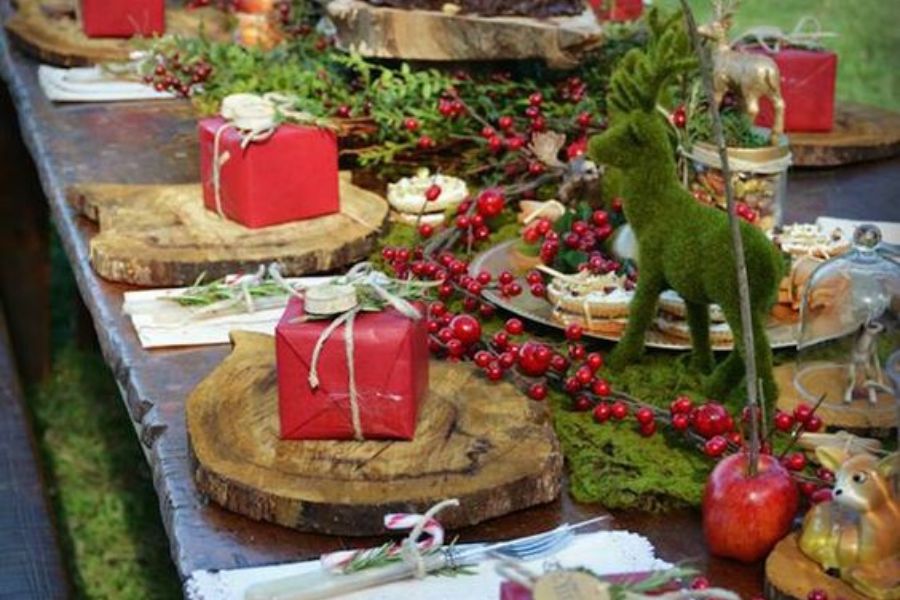 Dùng bàn gỗ để trang trí bàn tiệc Giáng sinh