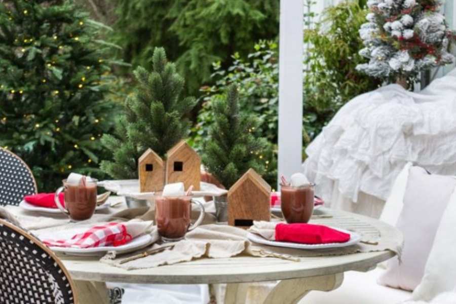 Không gian ngoài trời thoáng mát luôn là lựa chọn lý tưởng cho những buổi tiệc tối tại nhà. Với thời tiết se lạnh của những ngày cuối năm kết hợp cùng thức uống nóng sẽ tạo nên không khí vô cùng ấm áp trong ngày lễ. Bàn ăn chỉ cần trang trí đơn giản với nền và cây thông là đã có ngay bàn tiệc đẹp mắt, nhưng cũng rất ấm cúng.