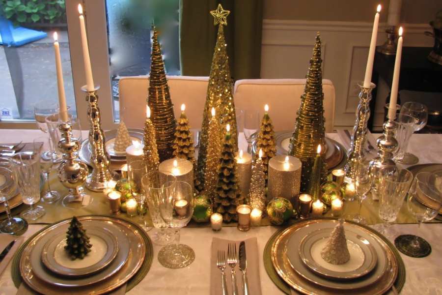 Gắn thêm một vài cây thông bé, được thắp sáng bằng dây đèn thì sẽ lại càng bắt mắt hơn nữa. Cách trang trí bàn tiệc Giáng Sinh này sẽ làm cho bàn tiệc của bạn sáng rực như vàng vậy!