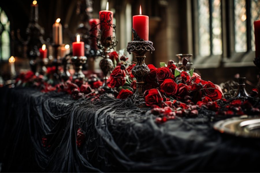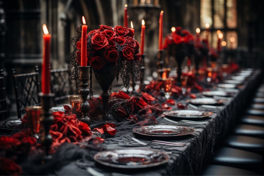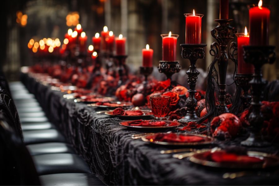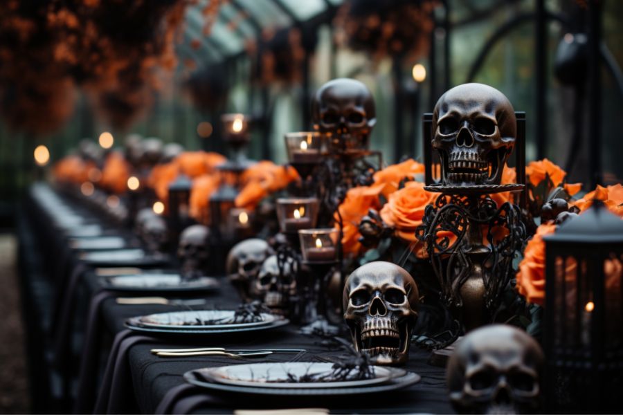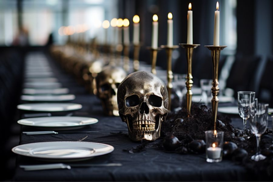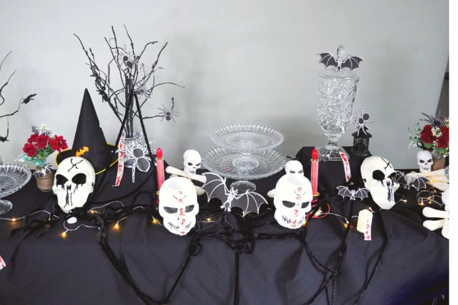 Tuy nhiên, để cho cách bày trí của bàn tiệc trông có gu và tinh tế hơn thì bạn nên lựa chọn các vật dụng có dạng hình đầu lâu như bóng đến hình đầu lâu, chân nến,… Hoặc bạn cũng có thể kết hợp dùng những chiếc ghế hình đầu lâu xếp quanh bàn tiệc để tăng tính ma mị.