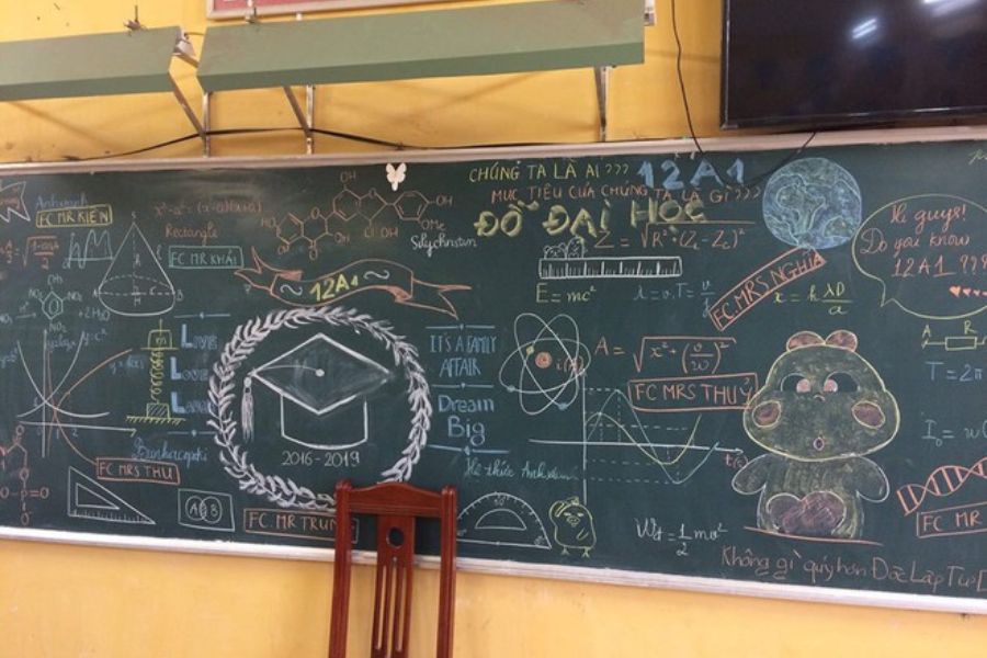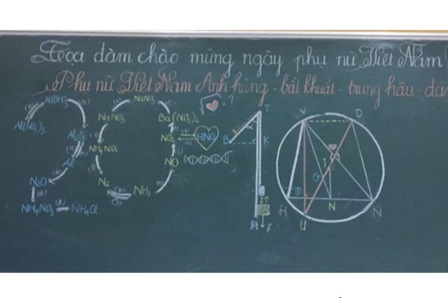 Việc kết hợp các môn khoa học vào việc trang trí bảng ngày 20/10 là một ý tưởng độc đáo và sáng tạo, cực phù hợp dành cho các lớp ban tự nhiên. Bảng có thể là bảng đen truyền thống, bảng trắng hiện đại với kích thước 2m x 1.5m phù hợp với không gian lớp học.