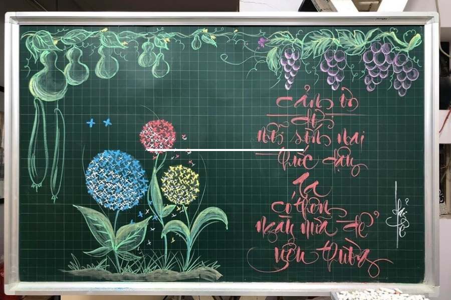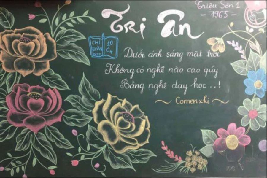 Với điểm nhấn là các hình ảnh bông hoa, mẫu bảng này đòi hỏi một chút sự khéo tay nhưng không quá phức tạp, phù hợp cho cả lớp tiểu học lẫn trung học.