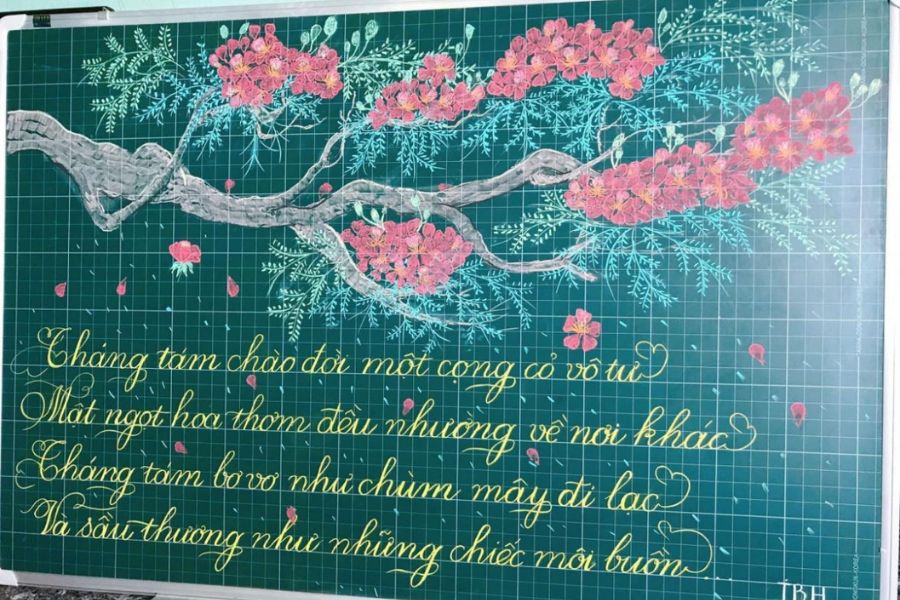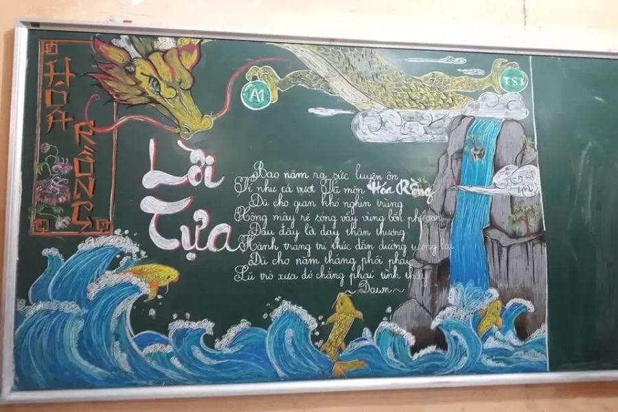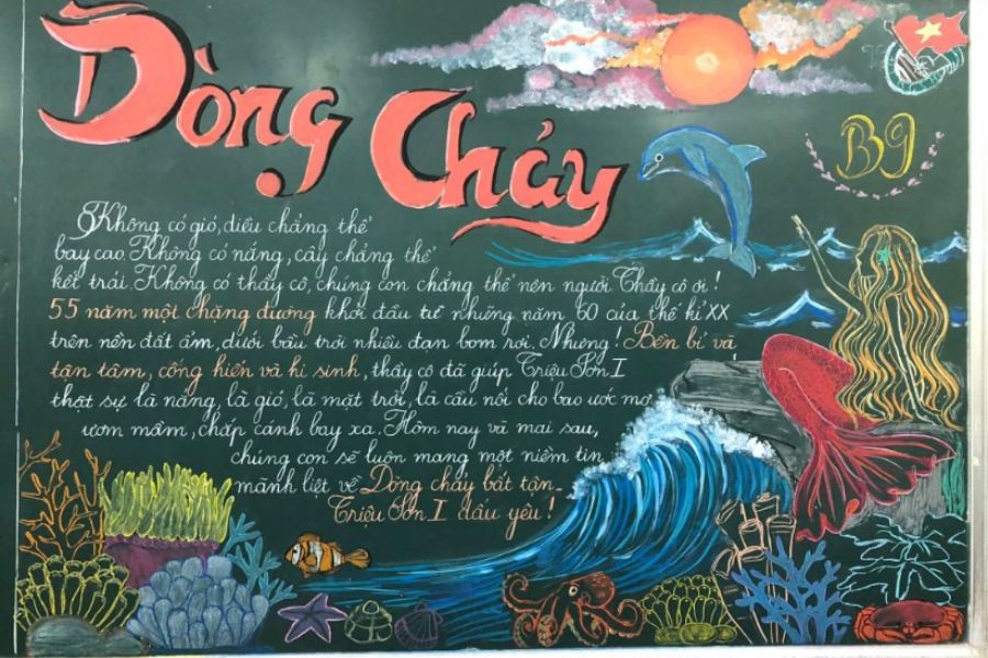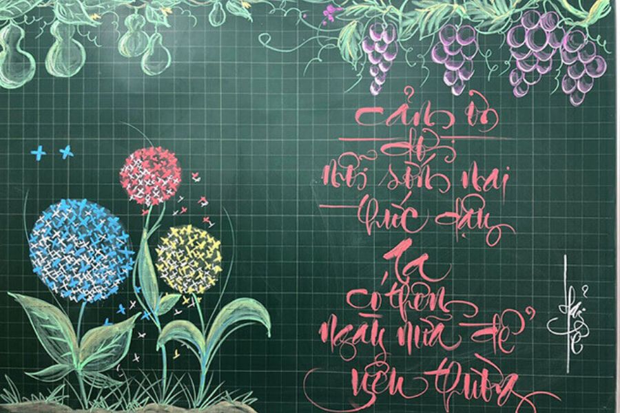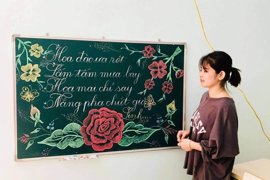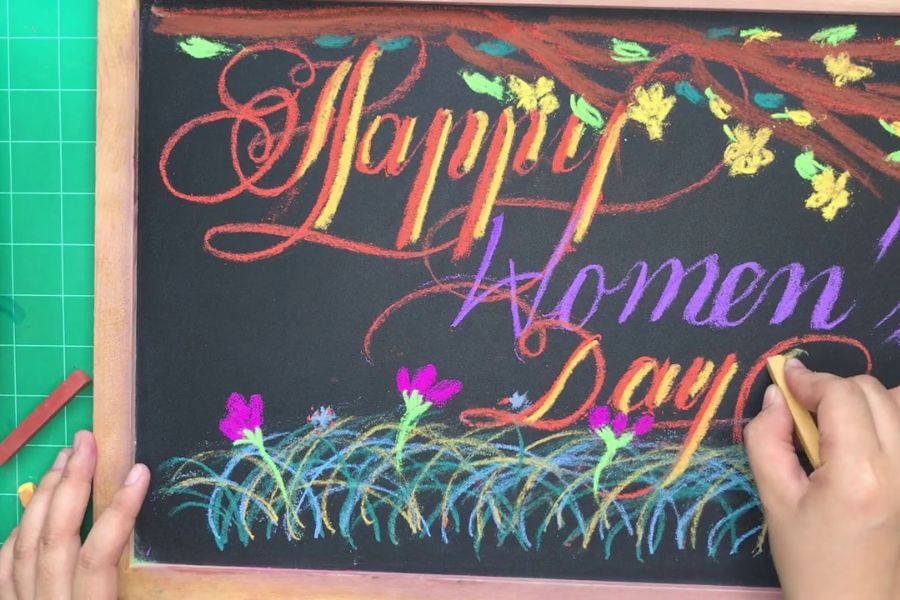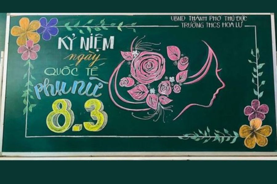 Sử dụng phấn màu: Đây là cách truyền thống và cũng là xu thế hiện nay bởi sự tiện dụng của các viên phấn. Các bạn có thể dùng phấn để vẽ những hình ảnh liên quan đến phụ nữ, như hoa, bướm, trái tim, nụ cười… và thêm những lời chúc, tri ân, thơ ca, tục ngữ về phụ nữ.
