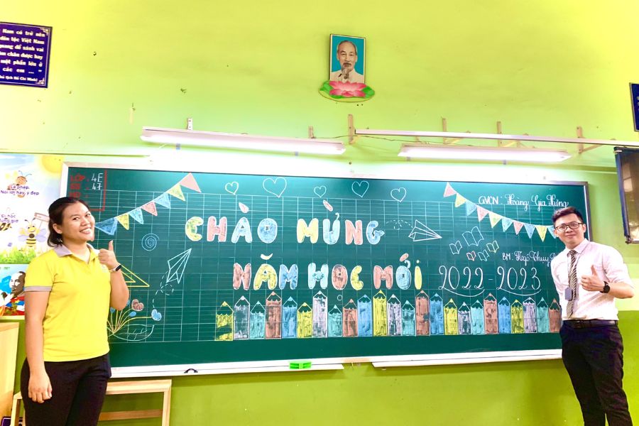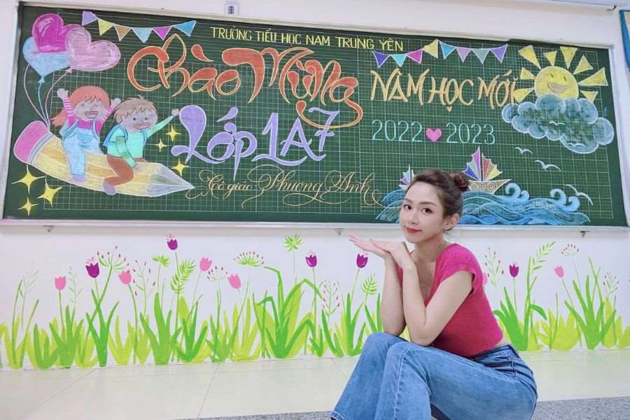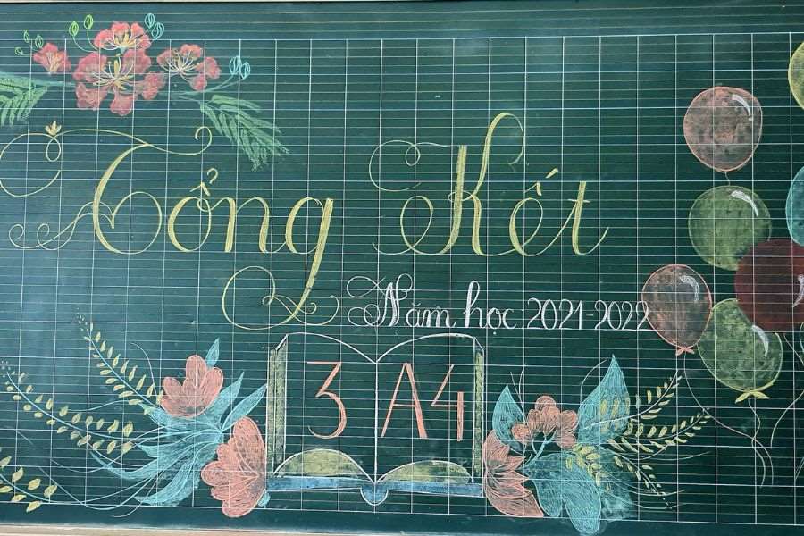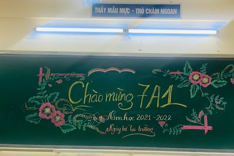 Các hình ảnh trang trí trên bảng nên đơn giản, gần gũi, phù hợp với môi trường sư phạm như hoa phượng, cây cối, quyển sách, bút mực, trường học,…