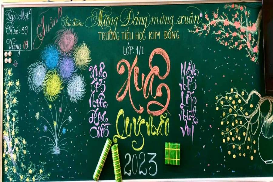 Nếu bạn có điều kiện, có thể mua những đồ dùng trang trí Tết để tạo thêm nét độc đáo và thu hút. Còn nếu không thì bạn chỉ cần sử dụng phấn và trang trí lên chiếc bảng, như vậy cũng đã rất đẹp rồi nếu bạn có bố cục và hình vẽ trang trí bảng ngày Tết hợp lý.