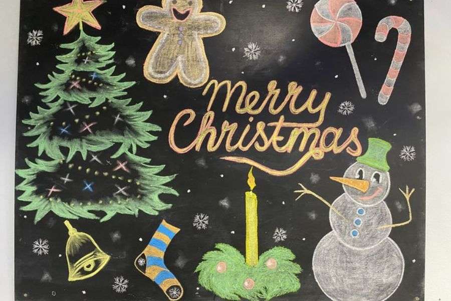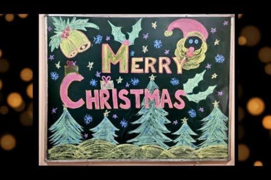 Bạn hãy dùng phấn và vẽ tranh Noel với những hình ảnh đặc trưng như cây thông, quả cầu tuyết, quả châu, ngôi nhà tuyết, ông già tuyết, hoa tuyết,… Bên cạnh đó, bạn có thể viết những thông điệp, điều ước, lời chúc Giáng Sinh ý nghĩa và ấm áp.
