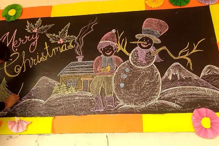Không chỉ là dụng cụ giảng dạy, học tập, phấn còn là vật liệu trang trí bảng lớp Noel hữu ích. Bạn đã có thể “thổi” vào không khí Giáng Sinh qua những viên phấn đầy màu sắc.
