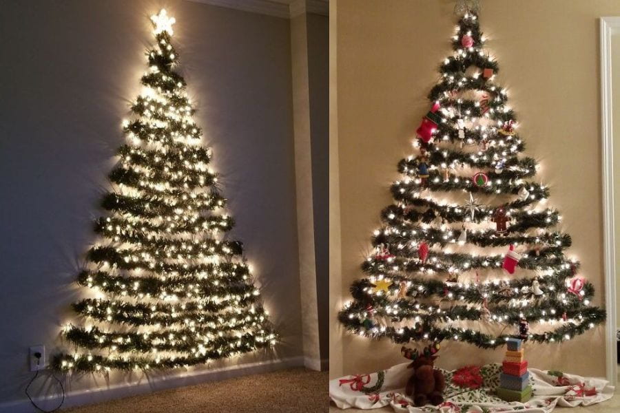 Trang trí cây thông Noel bằng dây kim tuyến và đèn LED là một ý tưởng tuyệt vời để tạo ra không khí Giáng Sinh giúp tiết kiệm được không gian và chi phí.