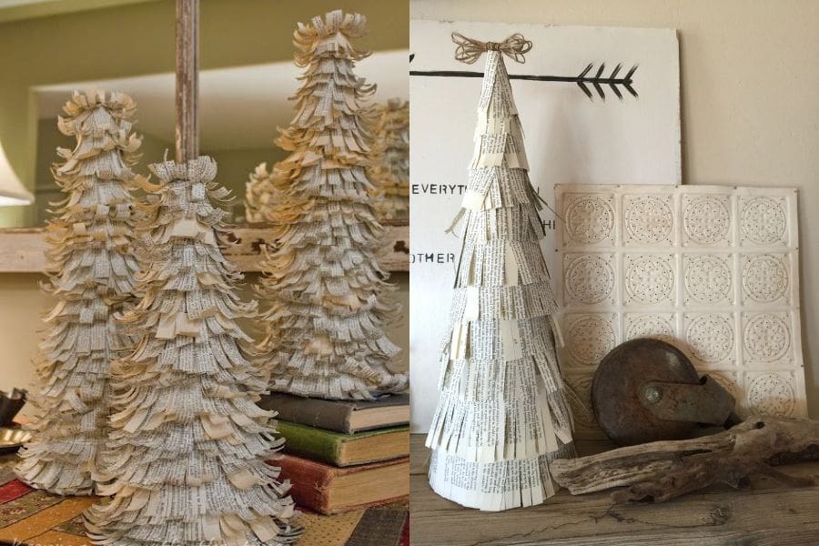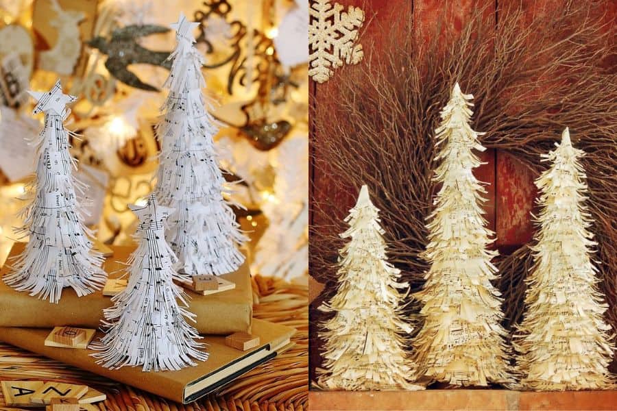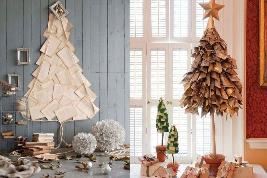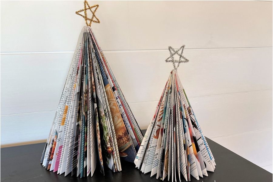 Bạn có thể tận dụng những quyển báo đã không sử dụng và thỏa sức sáng tạo ra cây thông Noel theo ý mình. Tuy nhiên, đừng quên trang trí thêm lên đó những phụ kiện trang trí như ngôi sao, hạt châu nhỏ, bông tuyết. Ngoài ra, có thể dùng màu sơn chủ đạo của Giáng Sinh như xanh, đỏ, vàng, trắng để “đổi áo” mới cho những tờ giấy cũ này.