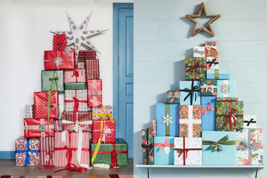 Tạo cây thông trên tường bằng cách xếp các gói quà dựa tường