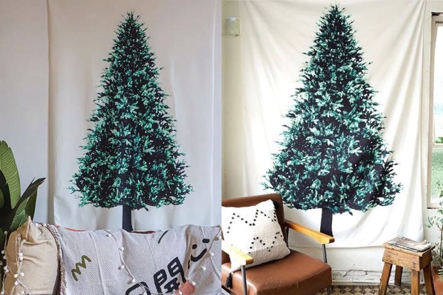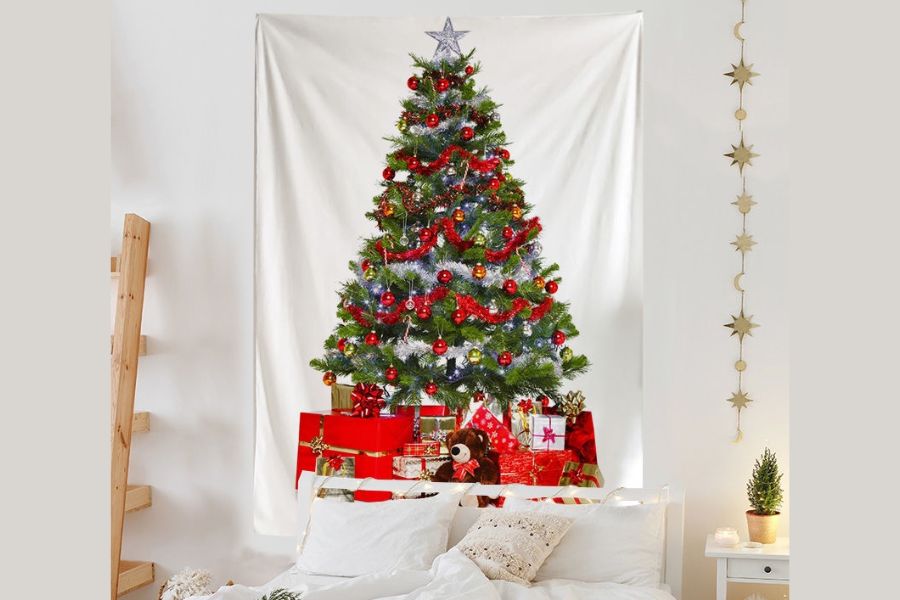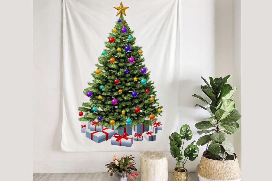 Để không tốn diện tích sàn và không gian thì trang trí cây thông với thảm vải trang trí là một ý tưởng không tồi. Thay vì phải lựa chọn những tấm áp phích bằng giấy dễ bị nhàu nát và rát thì việc lựa chọn vải sẽ mang đến hiệu quả sử dụng lâu bền hơn.