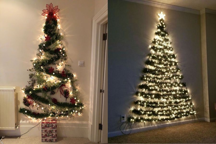 Nếu căn phòng của bạn có diện tích khiêm tốn, thay vì lãng phí không gian với một cây thông lớn, bạn có thể tận dụng bức tường trống để tạo ra một cây thông Noel. Bạn có thể thiết kế hình dáng cây Noel theo bất kỳ phong cách nào mình thích và lựa chọn những nơi để trang trí cây thông Noel trên tường.