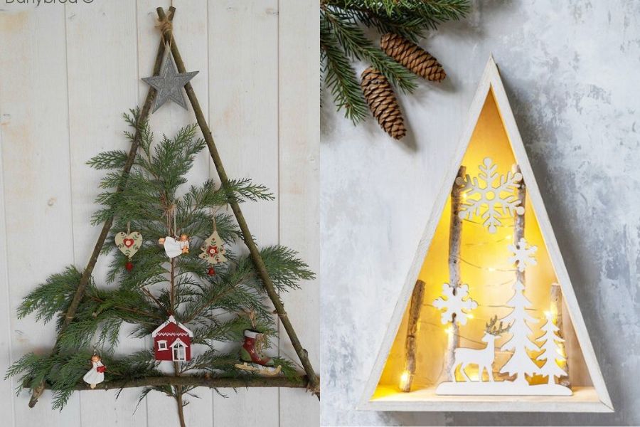 Thông thường, khi nhìn vào khung gỗ hình tam giác sẽ làm chúng ta gợi nhớ đến hình ảnh cây thông Noel. Chúng thường được làm từ những loại gỗ khác nhau như gỗ thông, gỗ thường, gỗ lim,… Nếu không có khung gỗ sẵn, bạn có thể dùng 3 nhánh củi khô lại với nhau để giúp tạo hình.