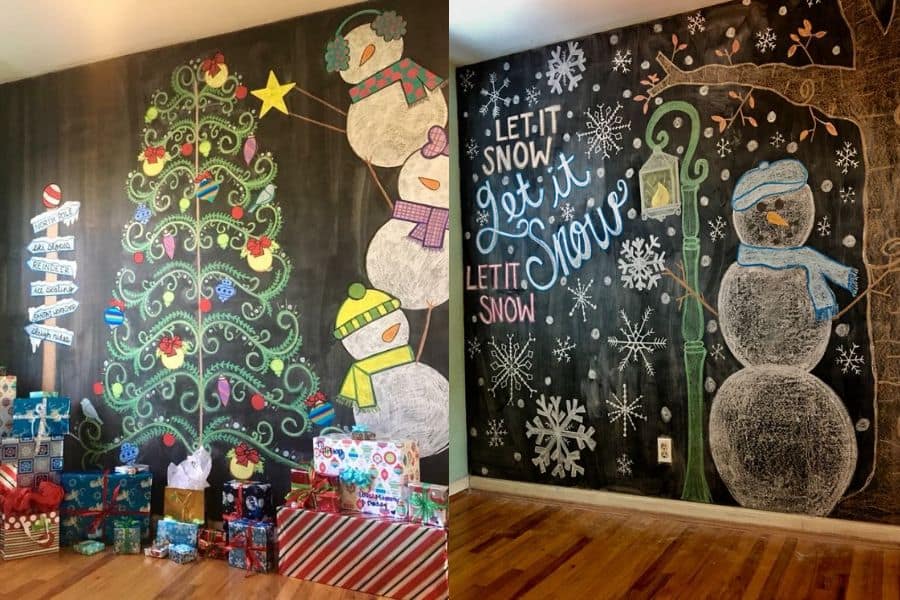 Nếu bạn là một người đam mê nghệ thuật thì việc dùng phấn màu để trang trí cây thông Noel trên tường hoặc bảng đen. Để cây thông Noel trở nên nổi bật và không bị “chìm nghỉm”, bạn có thể chọn những màu phấn có màu sắc sặc sỡ và đối lập với màu tường hoặc màu bảng.