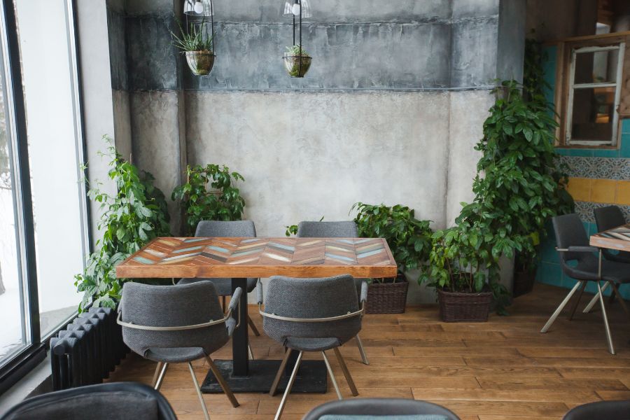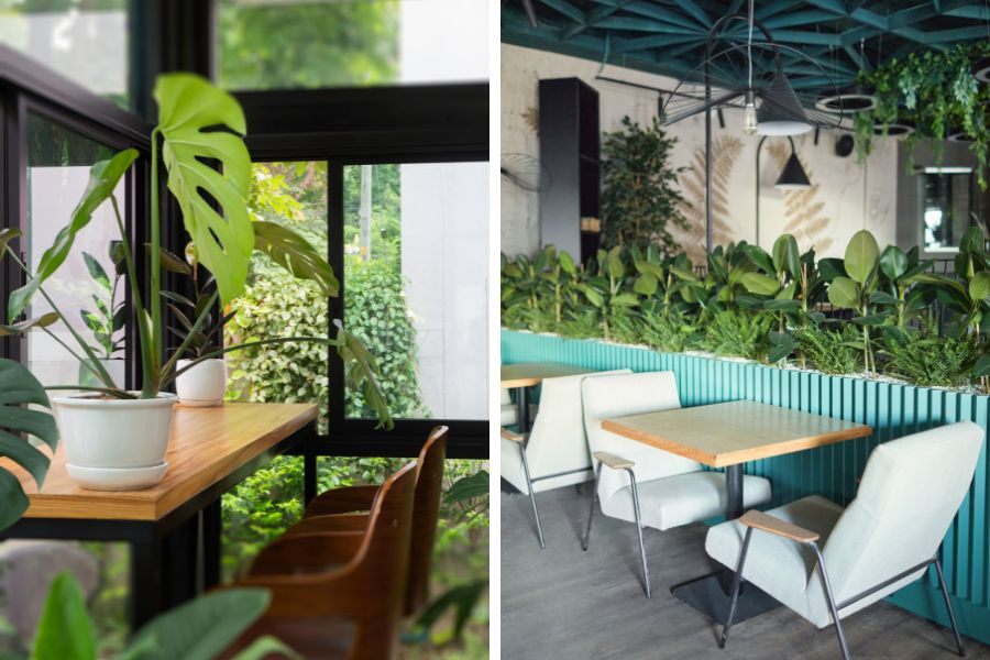 Sắp xếp bố cục đặt cây sao cho hài hòa với không gian quán. Mật độ trang trí cây xanh trong quán cafe cũng cần vừa phải, không nên quá ít hoặc quá nhiều vì sẽ tạo cảm giác trống trải hoặc quá rậm rạp.