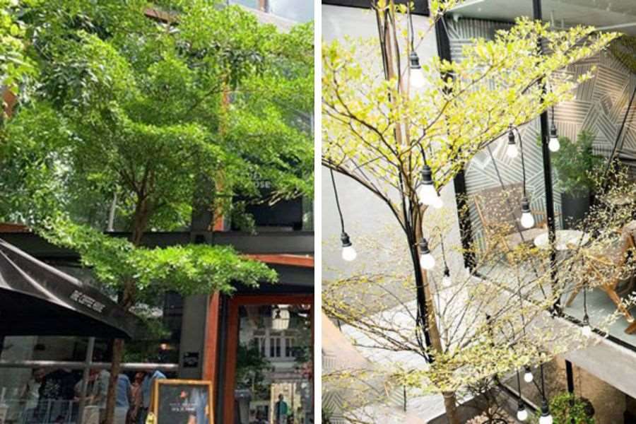 Cây bàng này có ý nghĩa phong thủy may mắn, đem lại tài lộc, thịnh vượng cho chủ quán. Loài cây này cũng có khả năng thanh lọc không khí, giúp không gian quán thêm trong lành, tươi mát hơn.