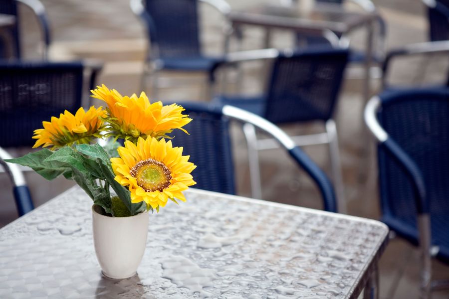 Hãy đặt một vài chậu, lọ hoa hướng dương trên bàn cafe để đem đến không gian cafe thu hút, tràn đầy hứng khởi hơn bạn nhé.