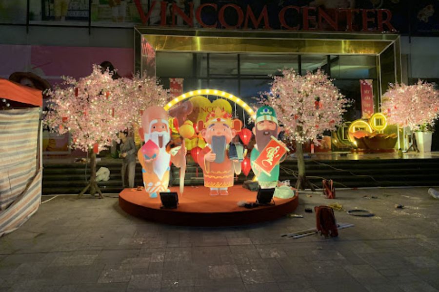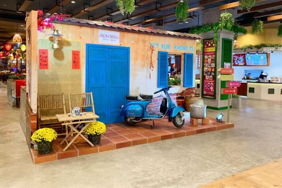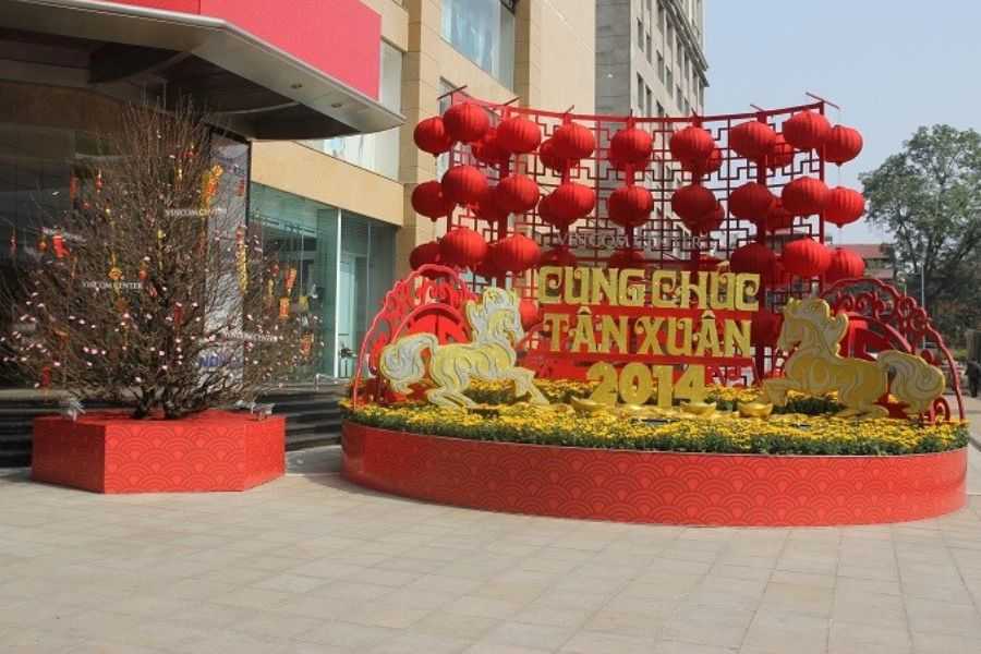 Cách trang trí: Tạo tiểu cảnh không gian phổ biến vào mùa tết như: chợ hoa, gia đình sum vầy, mâm ngũ quả,… ở trung tâm bên trong cửa hàng hoặc trước cửa hàng.