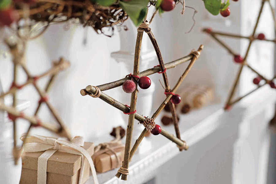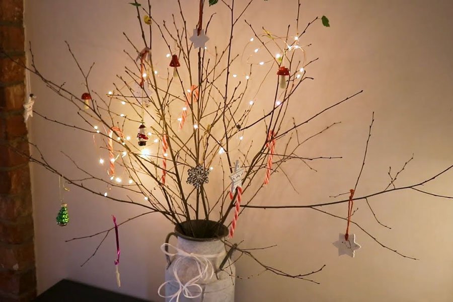 Nếu muốn gây ấn tượng bởi sự độc lạ và mới mẻ vào dịp Noel sắp tới, bạn có thể treo cành thông khô lên trên cao. Sau đó trang trí bằng đèn led và các quả châu tròn lấp lánh treo trên cành.